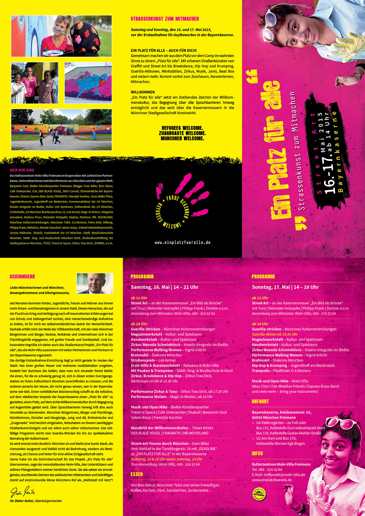 Nach zahlreichen Kunst-Projekten in der Erstaufnahmeeinrichtung für Asylbewerber Bayernkaserne mit BewohnerInnen und Ehrenamtlichen veranstaltet die Mohr-Villa jetzt mit vielen Partner_innen ein großes Gemeinschaftsprojekt, das die Idee der Straßenkunst aufgreift und um zusätzliche urbane und mobile Kunstformen erweitert: EIN PLATZ FÜR ALLE