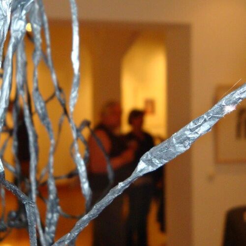 Gisela Birkenthal (Holzschnitt) und Barbara Kleiber-Wurm (Papierobjekte) spielen, formen, zeichnen, schnitzen und drucken mit diesen Begriffen.