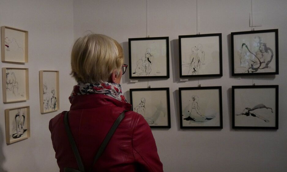 Eva-Maria Bischof-Kaupp gibt einen Einblick in ihr zeichnerisches Schaffen, für das sensible Bleistiftzeichnungen sowie kraftvolle Tuschelinien typisch sind. Das Papier, auf dem zarte Mohnblüten und Akte gezeichnet sind, ist dabei entscheidend für ihre Werke: Papier wird benäht, geknittert, geprägt oder auf andere Weise verändert und unterstreicht so den taktilen und experimentellen Charakter der Zeichnungen. Das Spiel mit dem Material erlaubt Bischof-Kaupp Ausflüge ins Dreidimensionale, auch in Kombination mit Draht. Neben Bleistift- und Tuschearbeiten sind auch Radierungen Teil ihrer Arbeiten.